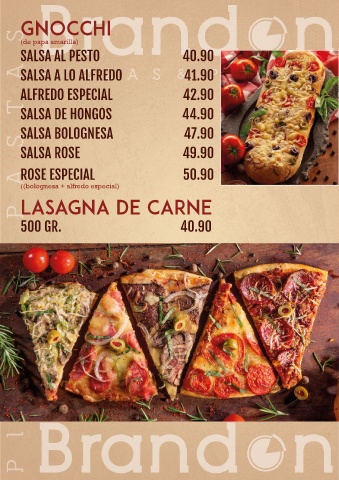 Gnocchi (de papa amarilla) SALSA AL PESTO 40.90 SALSA A LO ALFREDO 41.90 ALFREDO ESPECIAL 42.90 SALSA DE HONGOS 44.90 SALSA BOLOGNESA 47.90 SALSA ROSE 49.90 ROSE ESPECIAL 50.90 ((bolognesa + alfredo especial) LASAGNA DE CARNE 500 GR. 40.90